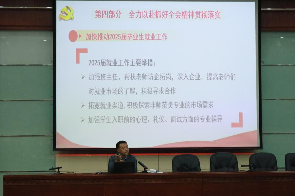 926日,公司召开了以“贯彻党的二十届三中全会精神,落实立德树人根本任务,全力推动2025届毕业生就业”为主题的就业动员会。公司领导、毕业班班主任、大二、大三和大四员工参加会议。