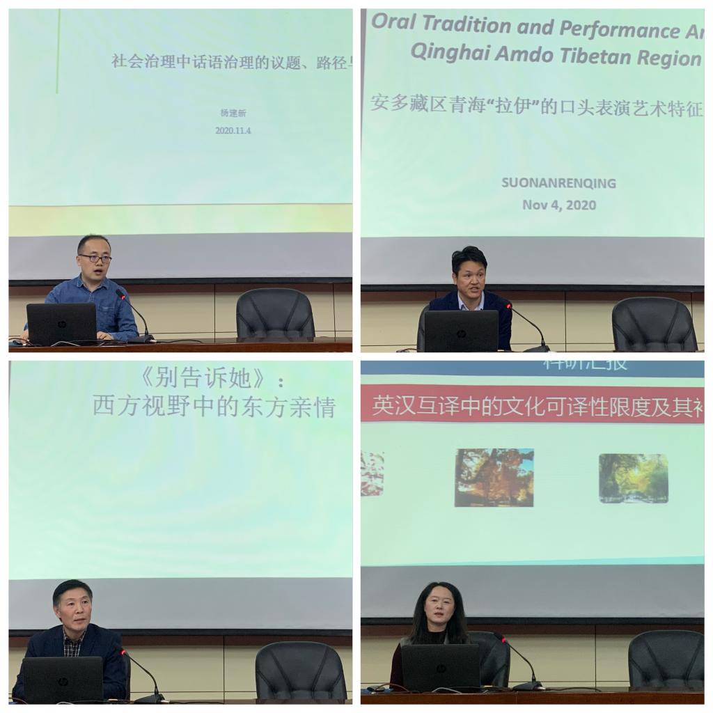 报告会上,杨建新博士从社会治理研究出发,系统梳理了社会治理中话语治理的学理渊源、研究议题以及路径方法,强调话语反映社会认知并影响人们对某一对象的认知,并借由此影响行为;索南仁青博士展示了进行安多藏区“拉伊”的口头表演艺术特征这一实证研究的研究背景、研究问题、研究方法与结论等内容,为运用实证方法研究非物质文化遗产提供了范例;赵尚副教授聚焦美国影片《别告诉她》,分析了影片的叙事策略,对比了东西方文化差异,指出影片体现了西方视野下的东方亲情;闫凤霞副教授以等效翻译理论为切入点,从语音层、词汇层、语法层和文体层等方面分析了文化的可译性限度,进而讨论了翻译补偿策略。