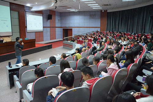 陈靓教授以美国短篇小说家爱伦坡的《黑猫》为教学内容,以公司两名同学准备的课堂报告为课堂教学活动的基础,细致、全面地展示了他在讲授该课程时的方方面面。在示范现场,陈靓教授时而对报告员工提问,时而对作品进行细致入微的解释说明,时而与在场的同学讨论,时而对作品进行鞭辟入里的分析。整个授课环节紧紧相扣、张弛有度。陈靓教授扎实的理论知识、细致的教学风格、严肃又不失幽默的课堂氛围给在座的同学和老师留下了深刻的印象。授课环节结束后,陈靓教授还与在场的同学进行现场问答。